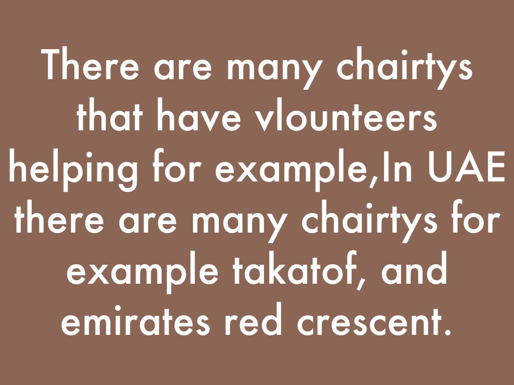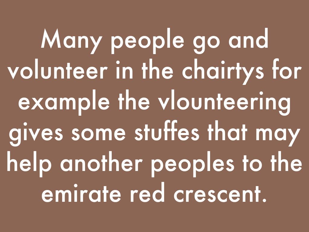 Many people go and volunteer in the chairtys for example the vlounteering gives some stuffes that may help another peoples to the emirate red crescent.