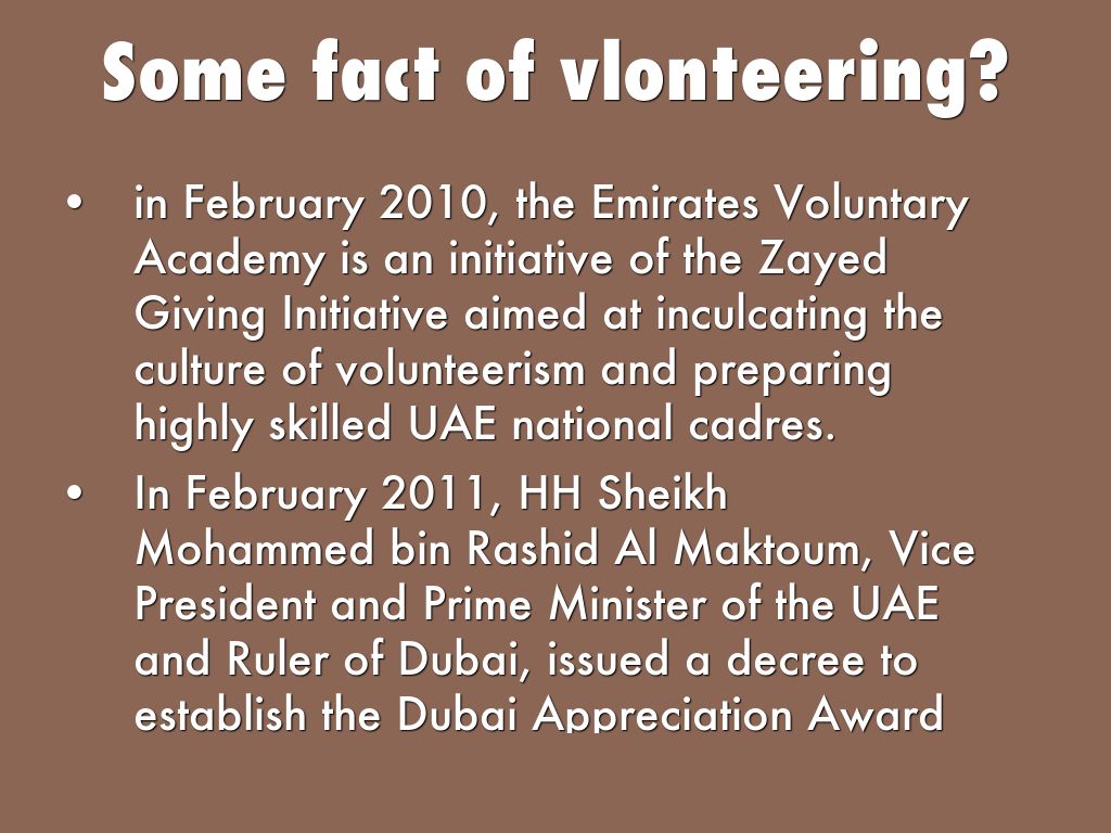 • in February 2010, the Emirates Voluntary Academy is an initiative of the Zayed Giving Initiative aimed at inculcating the culture of volunteerism and preparing highly skilled UAE national cadres.