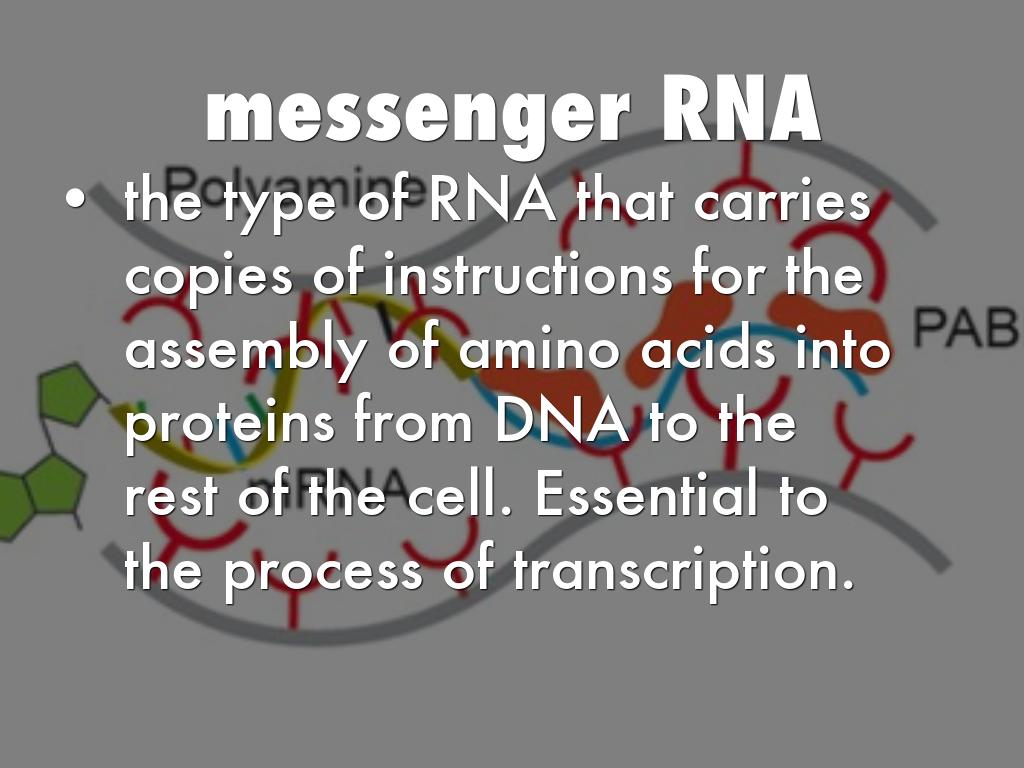 the type of RNA that carries copies of instructions for the assembly of amino acids into proteins from DNA to the rest of the cell. Essential to the process of transcription.