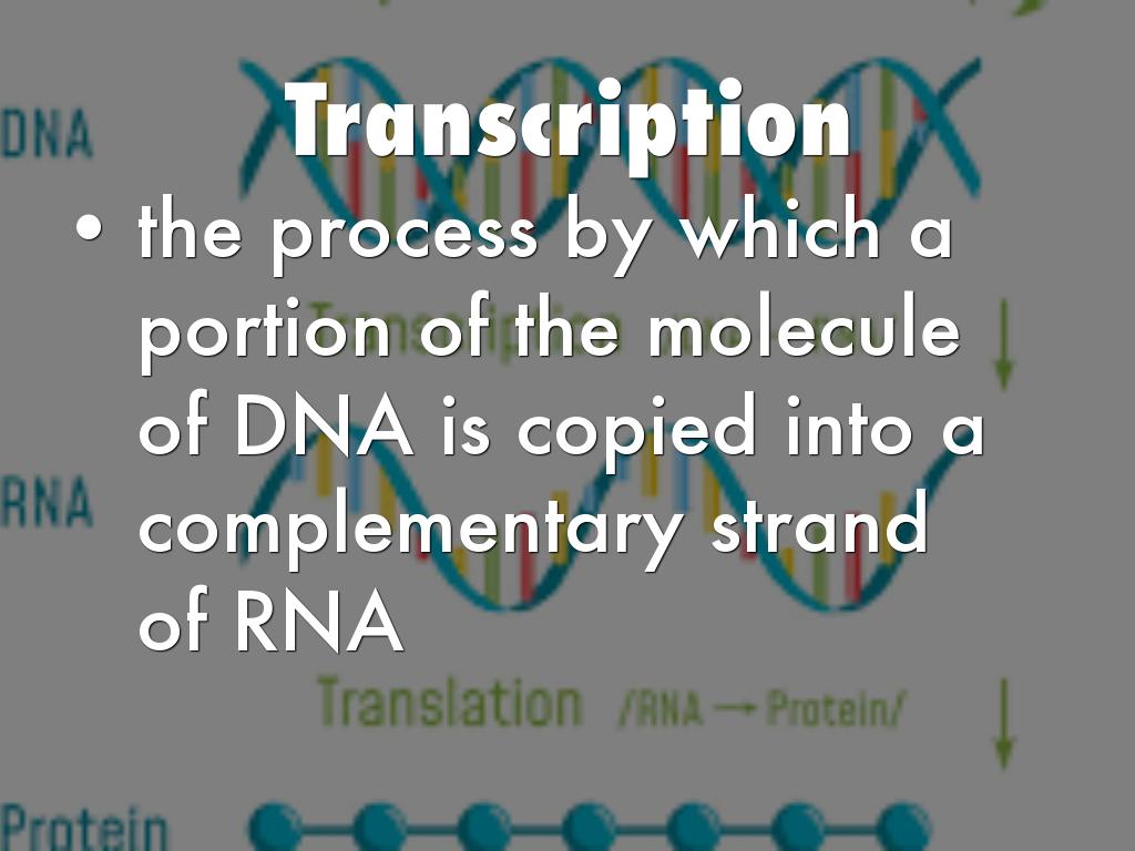 the process by which a portion of the molecule of DNA is copied into a complementary strand of RNA