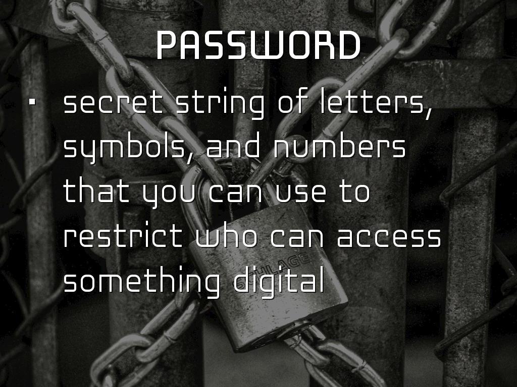 secret string of letters, symbols, and numbers that you can use to restrict who can access something digital