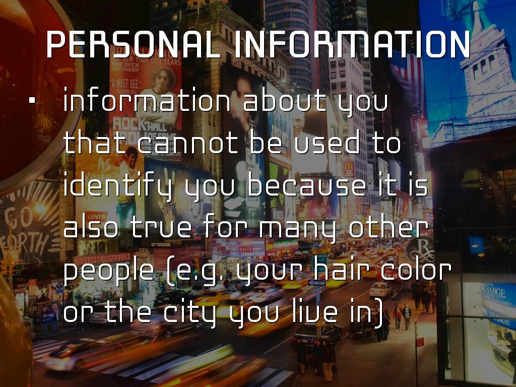 information about you that cannot be used to identify you because it is also true for many other people (e.g. your hair color or the city you live in)