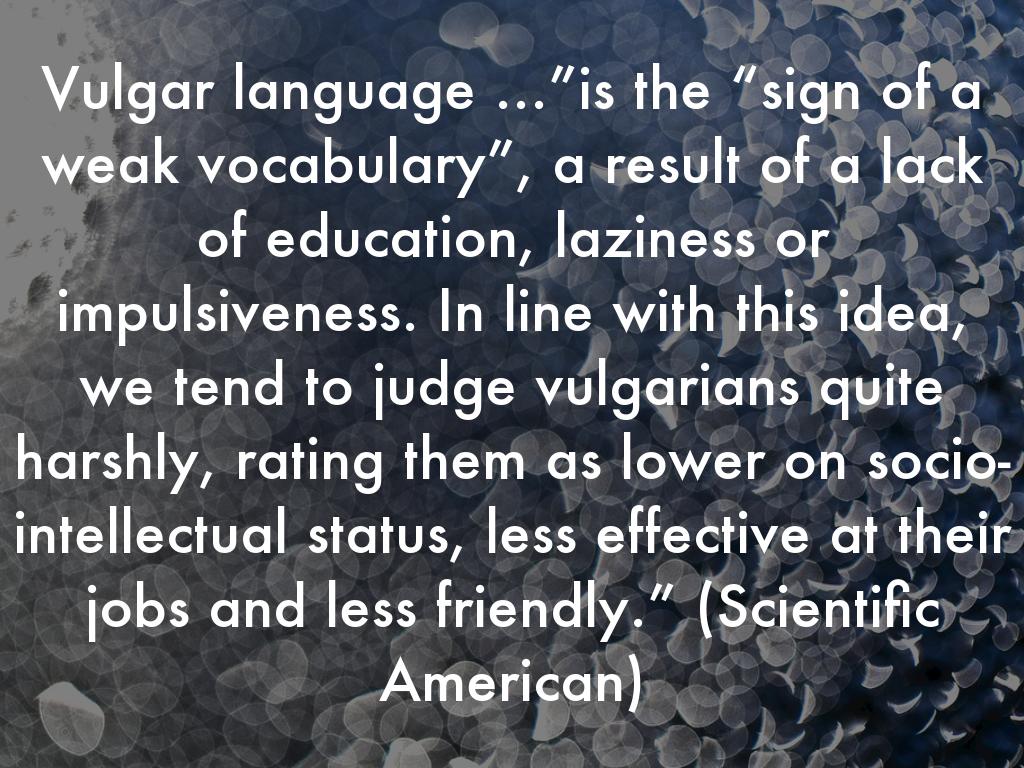 Vulgar language ...”is the “sign of a weak vocabulary”, a result of a lack of education, laziness or impulsiveness. In line with this idea, we tend to judge vulgarians quite harshly, rating them as lower on socio-intellectual status, less effective at their jobs and less friendly.” (Scientific American)