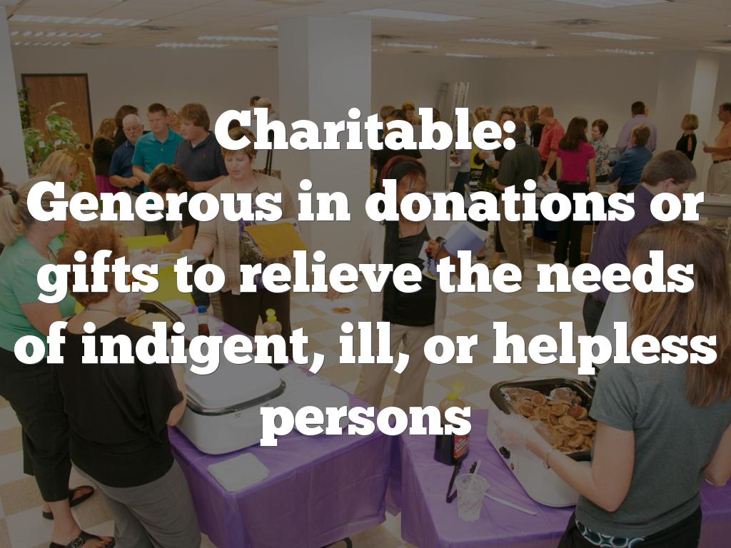 Generous in donations or gifts to relieve the needs of indigent, ill, or helpless persons