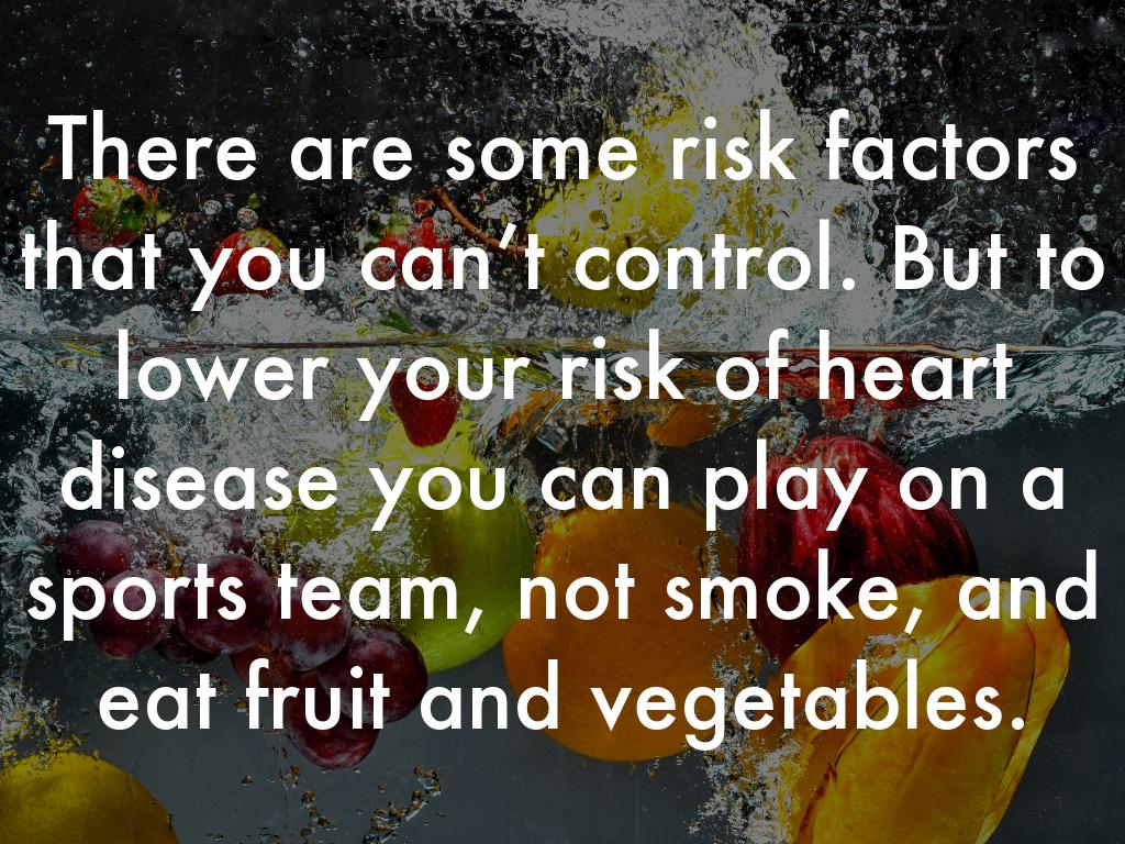 There are some risk factors that you can’t control. But to lower your risk of heart disease you can play on a sports team, not smoke, and eat fruit and vegetables.