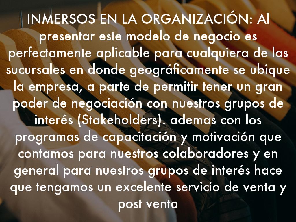 INMERSOS EN LA ORGANIZACIÓN: Al presentar este modelo de negocio es perfectamente aplicable para cualquiera de las sucursales en donde geográficamente se ubique la empresa, a parte de permitir tener un gran poder de negociación con nuestros grupos de interés (Stakeholders). ademas con los programas de capacitación y motivación que contamos para nuestros colaboradores y en general para nuestros grupos de interés hace que tengamos un excelente servicio de venta y post venta