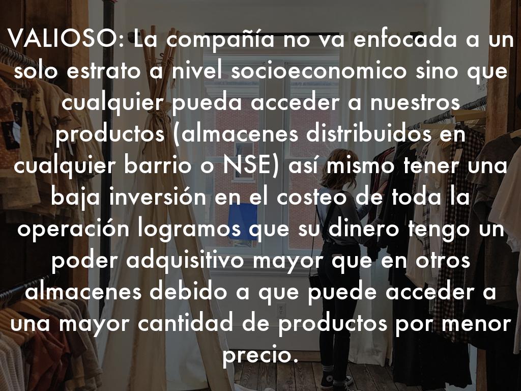 VALIOSO: La compañía no va enfocada a un solo estrato a nivel socioeconomico sino que cualquier pueda acceder a nuestros productos (almacenes distribuidos en cualquier barrio o NSE) así mismo tener una baja inversión en el costeo de toda la operación logramos que su dinero tengo un poder adquisitivo mayor que en otros almacenes debido a que puede acceder a una mayor cantidad de productos por menor precio.