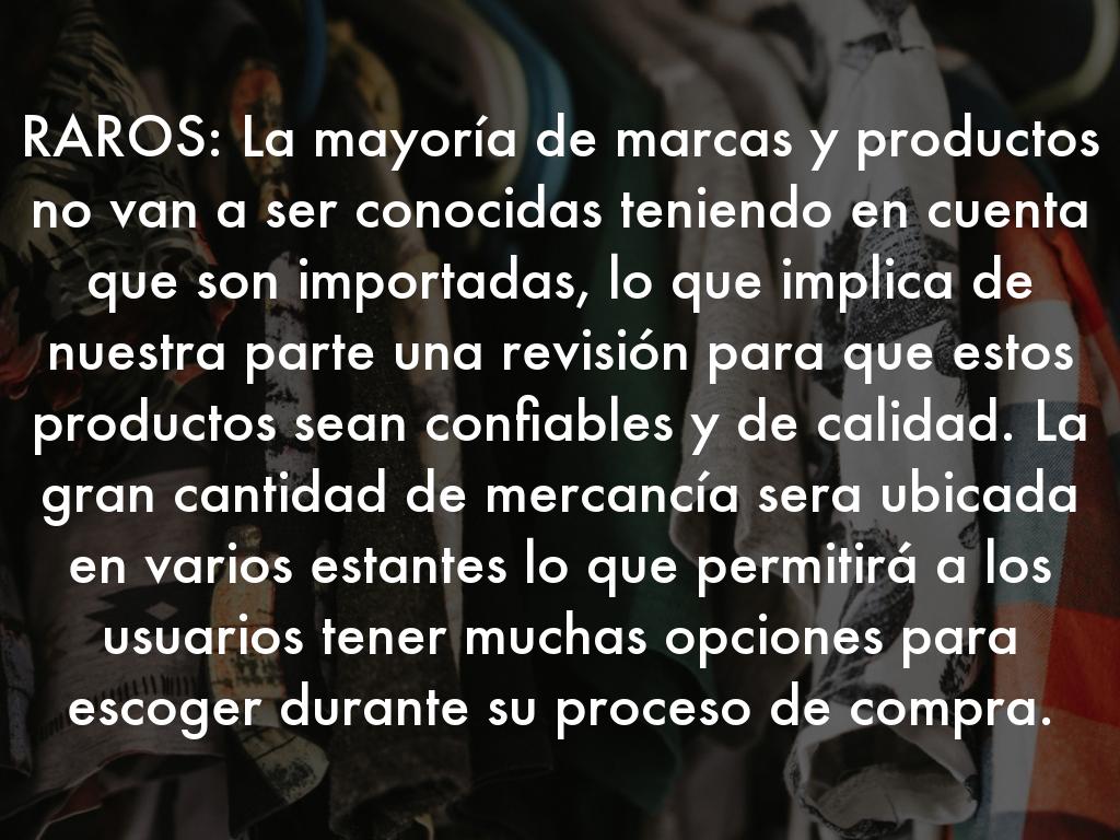 RAROS: La mayoría de marcas y productos no van a ser conocidas teniendo en cuenta que son importadas, lo que implica de nuestra parte una revisión para que estos productos sean confiables y de calidad. La gran cantidad de mercancía sera ubicada en varios estantes lo que permitirá a los usuarios tener muchas opciones para escoger durante su proceso de compra.
