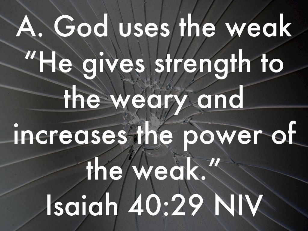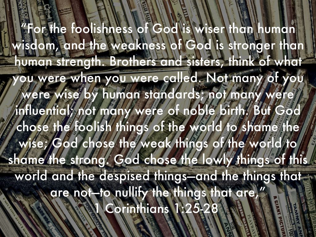 “For the foolishness of God is wiser than human wisdom, and the weakness of God is stronger than human strength. Brothers and sisters, think of what you were when you were called. Not many of you were wise by human standards; not many were influential; not many were of noble birth. But God chose the foolish things of the world to shame the wise; God chose the weak things of the world to shame the strong. God chose the lowly things of this world and the despised things—and the things that are not—to nullify the things that are,” 1 Corinthians 1:25-28