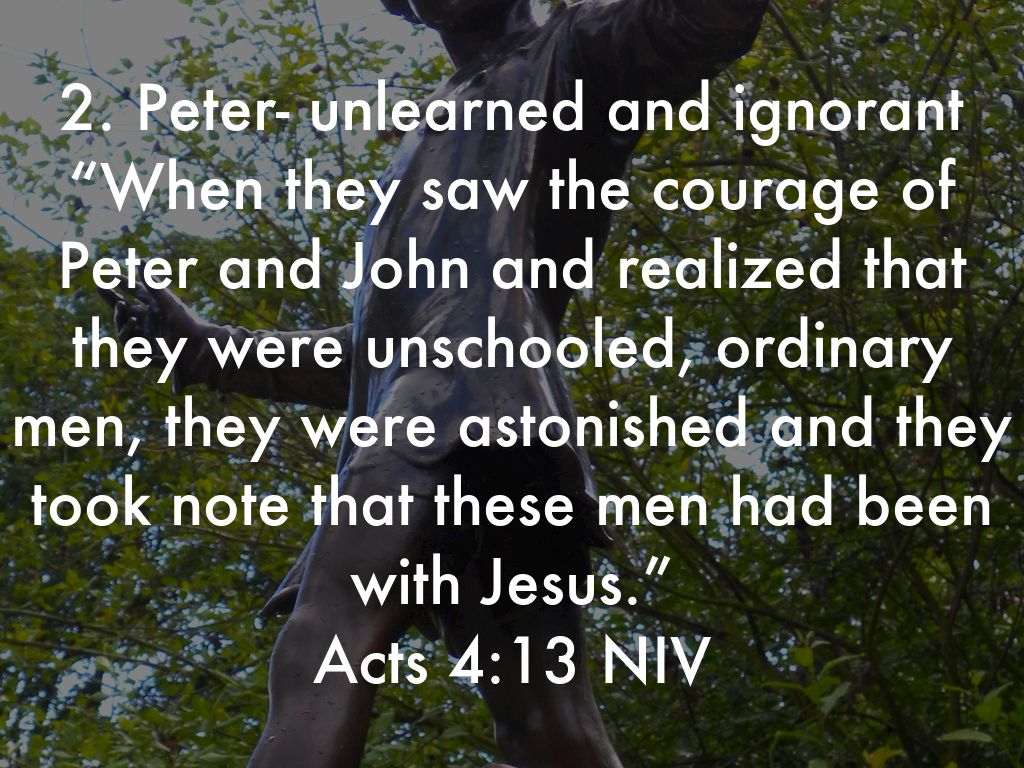 2. Peter- unlearned and ignorant “When they saw the courage of Peter and John and realized that they were unschooled, ordinary men, they were astonished and they took note that these men had been with Jesus.” Acts 4:13 NIV