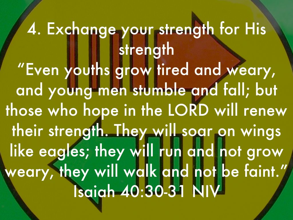 4. Exchange your strength for His strength “Even youths grow tired and weary, and young men stumble and fall; but those who hope in the LORD will renew their strength. They will soar on wings like eagles; they will run and not grow weary, they will walk and not be faint.” Isaiah 40:30-31 NIV