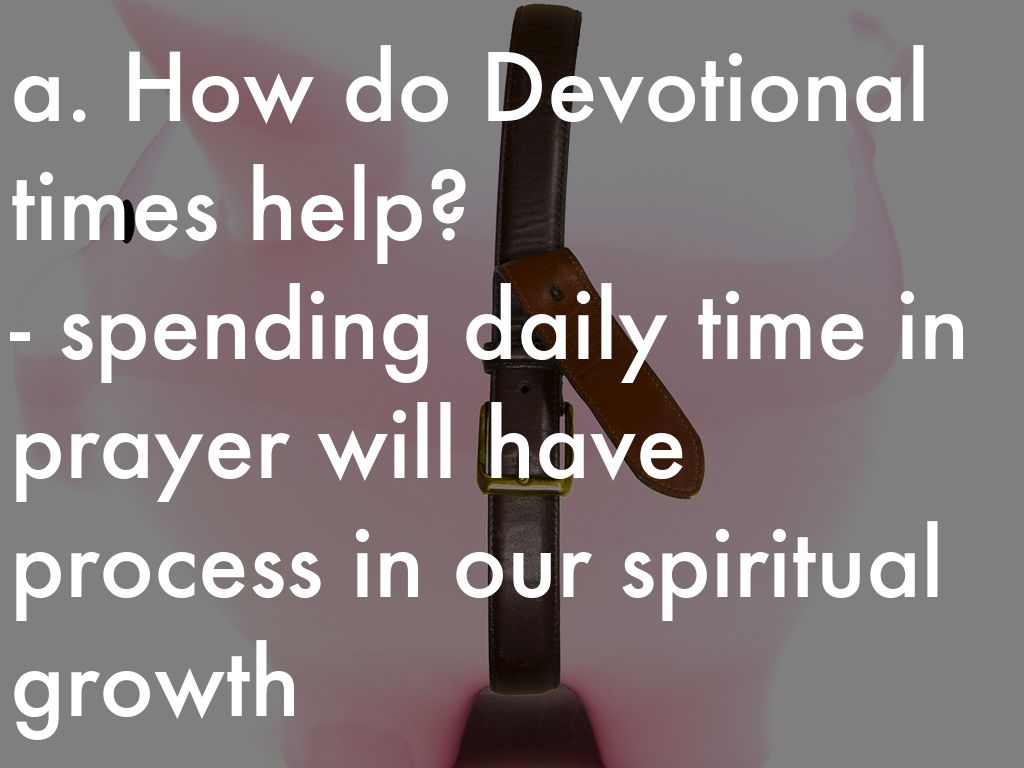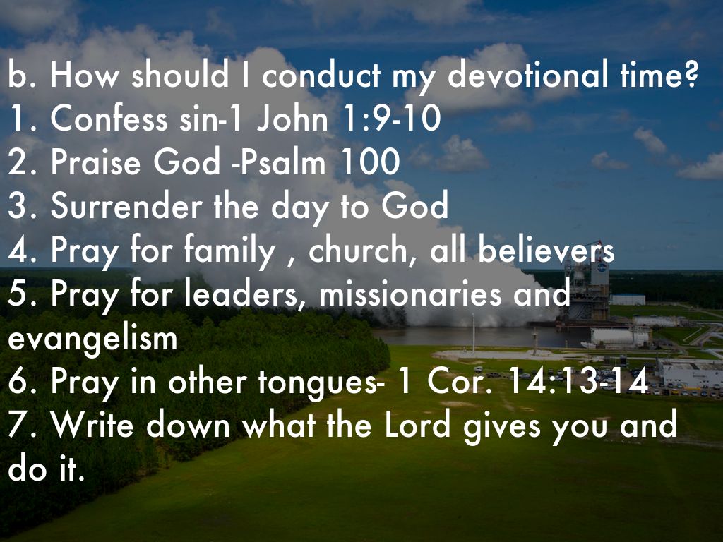 b. How should I conduct my devotional time? 1. Confess sin-1 John 1:9-10 2. Praise God -Psalm 100 3. Surrender the day to God 4. Pray for family , church, all believers 5. Pray for leaders, missionaries and evangelism 6. Pray in other tongues- 1 Cor. 14:13-14 7. Write down what the Lord gives you and do it.