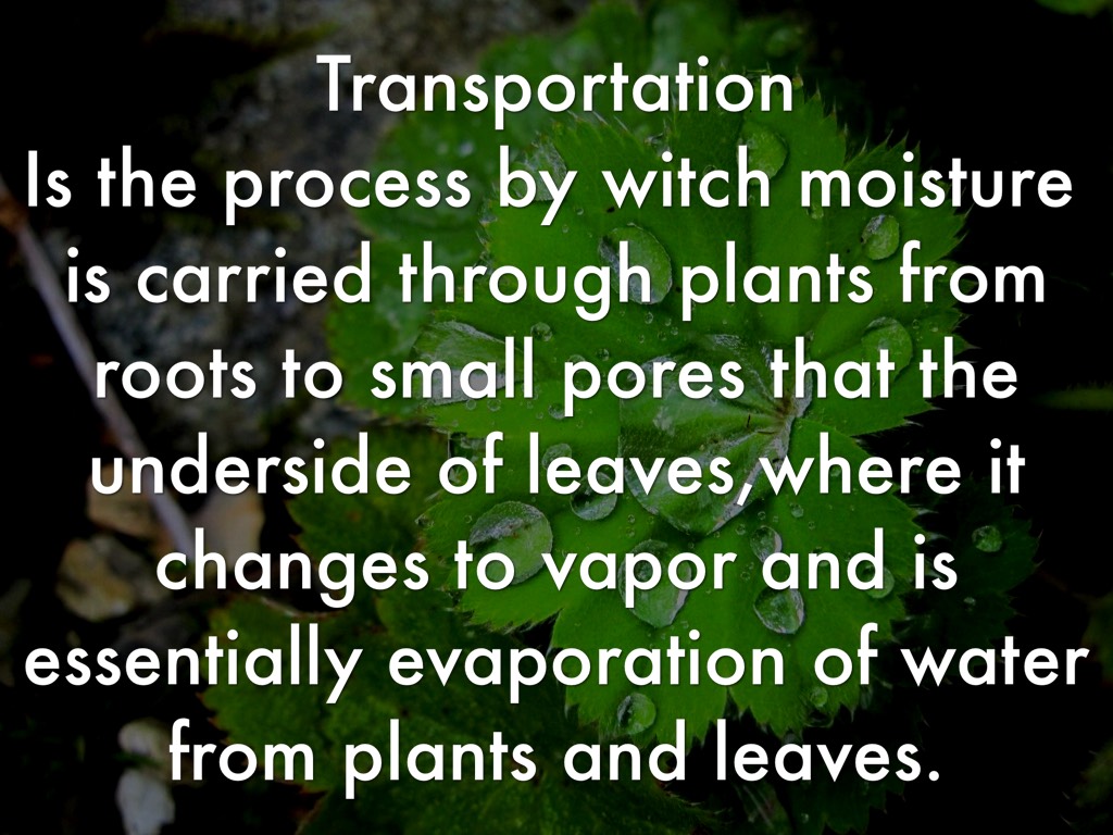 Is the process by witch moisture is carried through plants from roots to small pores that the underside of leaves,where it changes to vapor and is essentially evaporation of water from plants and leaves.