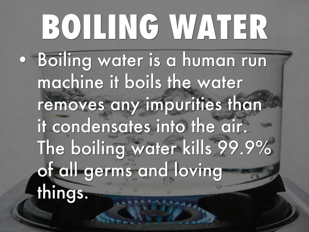 Boiling water is a human run machine it boils the water removes any impurities than it condensates into the air. The boiling water kills 99.9% of all germs and loving things.