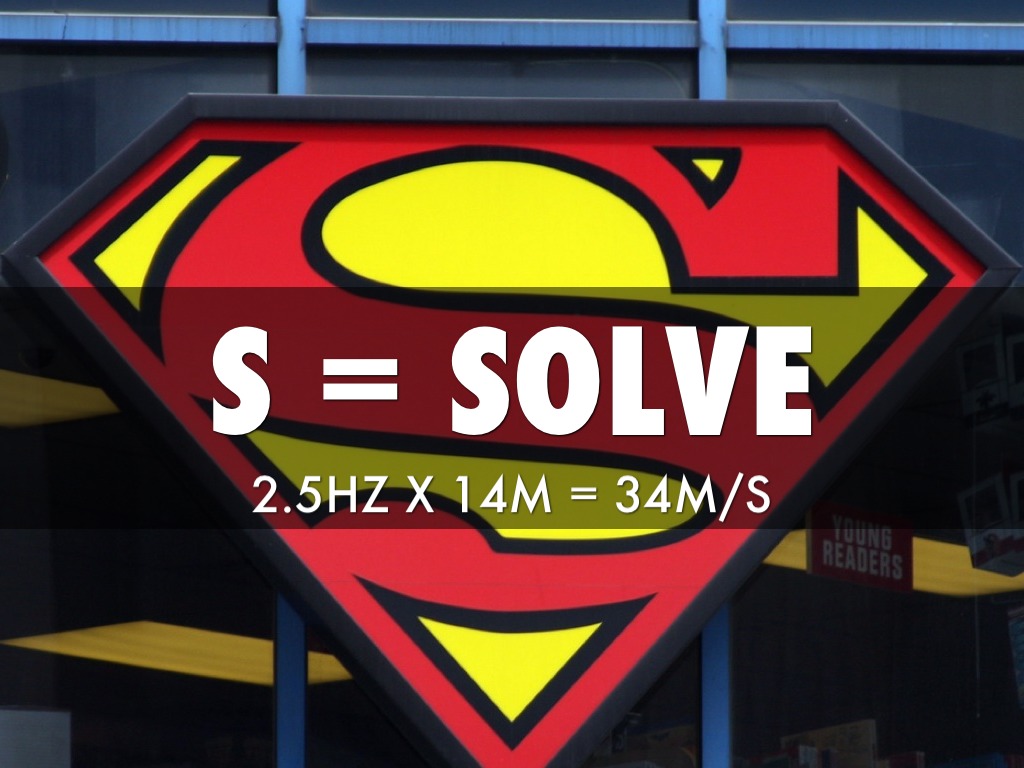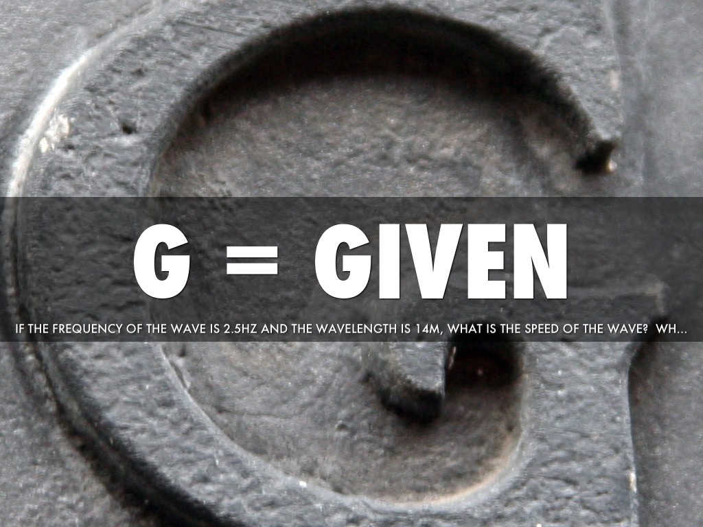 IF THE FREQUENCY OF THE WAVE IS 2.5HZ AND THE WAVELENGTH IS 14M, WHAT IS THE SPEED OF THE WAVE? WHAT ARE YOU GIVEN? WL - 14M ; FREQUENCY - 1.2HZ