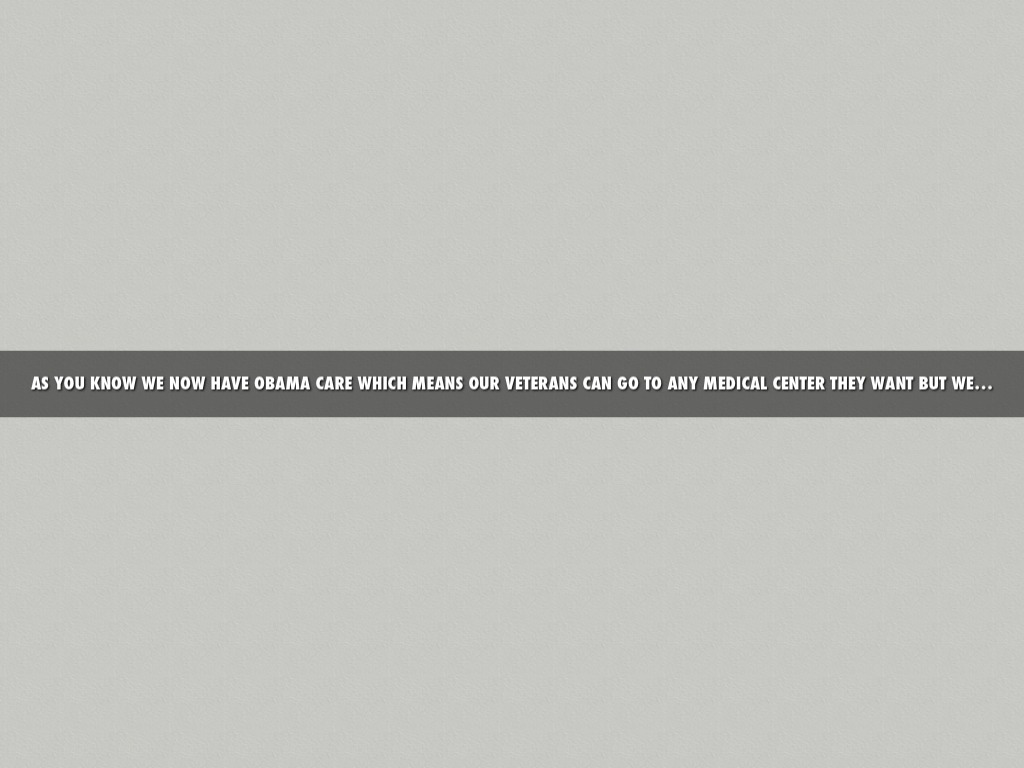 AS YOU KNOW WE NOW HAVE OBAMA CARE WHICH MEANS OUR VETERANS CAN GO TO ANY MEDICAL CENTER THEY WANT BUT WE TAKE CARE OF OUR OWN. IN ORDER FOR US TO KEEP OUR VETERANS COMING BACK WE MUST PROVIDE TOP NOTCH CARE AND TIMELY CARE WITH NO DELAYS BECAUSE NO ONE WANTS TO BE STUCK IN A HOSPITAL ALL DAY THEY HAVE OTHER THINGS TO DO SO I AM ASKING EVERYONE HERE TODAY TO HELP ME TO PROVIDE THE BEST CARE AND TIMELY SERVICE WE KNOW WE CAN BECAUSE WE TAKE CARE OF OUR OWN