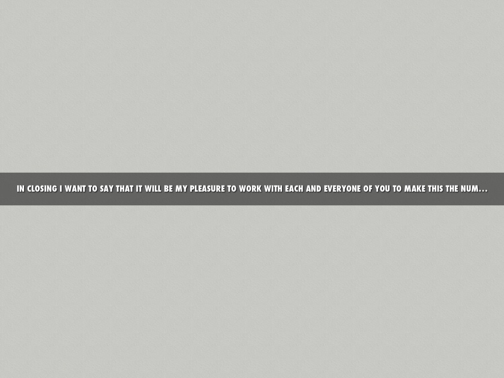 IN CLOSING I WANT TO SAY THAT IT WILL BE MY PLEASURE TO WORK WITH EACH AND EVERYONE OF YOU TO MAKE THIS THE NUMBER ONE HOSPITAL IN THE COUNTRY SO IF I CAN PLEASE COME KNOCK ON MY DOOR IF I AM NOT BUSY COME IN AND TAKE A LOAD OFF AND TALK TO ME.REMEMBER THAT SOMETIMES A MAY BE BUSY BUT MAKE AN APPOINTMENT WITH MY SECURTARY AND I WILL GET WITH YOU SO PLEASE BE PATIENT. REMEMBER ONE THING AS YOU WALK OUT OF THAT DOOR "WE ARE FAMILY I GOT ALL MY BROTHERS AND SISTERS WITH ME THANK YOU.