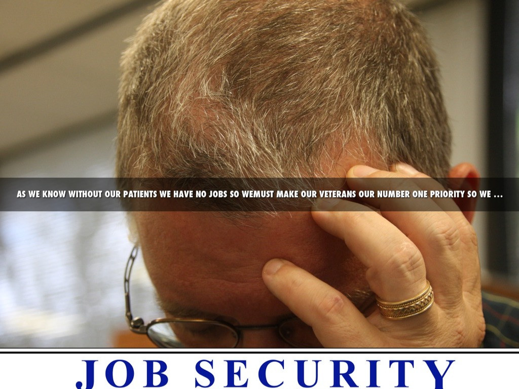 AS WE KNOW WITHOUT OUR PATIENTS WE HAVE NO JOBS SO WEMUST MAKE OUR VETERANS OUR NUMBER ONE PRIORITY SO WE MUST DO HAVE JOB TO KEEP THEM HAPPY COMFORTABLE AND SECURE. JOBS ARE HARD TO FIND TODAY AND THERE IS ALWAYS SOMEONE ON THE OUTSIDE READY TO COME IN AND TAKE YOUR PLACE AND WE MUST TAKE BETTER CARE OF THE EMPLOYEES WE HAVE EVEN PROMOTING FROM WITHIN. EVERY TIME I SAW AN NEW PERSON COME IN OFF THE STREET WHILE I WAS IN FOOD SERVICE I THOUGHT I WASN'T DOING MY JOB CORRECTLY TO WHERE MY SUPERVISOR HAD NO FAITH THAT I COULD MOVE UP