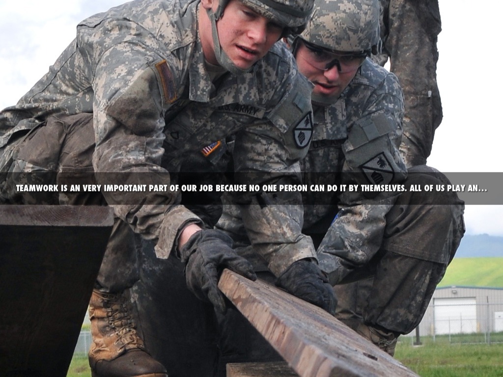TEAMWORK IS AN VERY IMPORTANT PART OF OUR JOB BECAUSE NO ONE PERSON CAN DO IT BY THEMSELVES. ALL OF US PLAY AN IMPORTANT PART OF OUR EVERYDAY MISSION IT TAKE DOCTORS TO SEE WHAT IS WRONG WITH THE PATIENT NURSES TO CARRY OUT THE ORDERS OF THE DOCTOR NURTUITON TO SERVE A NUISHING MEAL PHYSICAL THERPIST TO HELP BROKEN BONES MOVE AGAIN AND HOUSEKEEPING TO KEEP OUR HOSPITAL CLEAN AND SANTITED SO WEALL PLAY A VITAL PART IN THIS HOSPITAL.