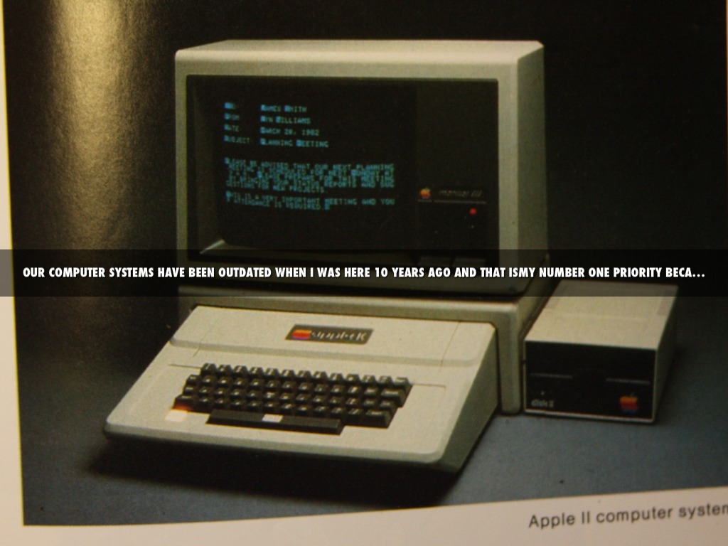 OUR COMPUTER SYSTEMS HAVE BEEN OUTDATED WHEN I WAS HERE 10 YEARS AGO AND THAT ISMY NUMBER ONE PRIORITY BECAUSE WE NEED FASTER COMPUTER SYSTEMS IN ALL PARTS OF OUR HOSPITAL. WE NEED TO UPDATE TO WHAT IS HAPPENING NOW MICROSOFT 2023 TO SERVE OUR VETERANS FASTER AND TIMELY FOR OUR EMPLOYEES WHO HAVE TO LOOK UP PATIENT INFORMATION AND FASTER ACCESS TO THEIR OWN PERSONAL COMPUTER NEEDS SO WE MUST IMPROVE OUR COMPUTER SYSTEM