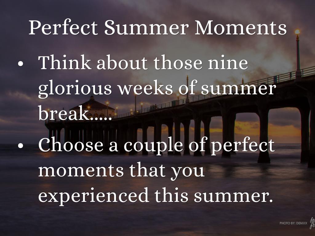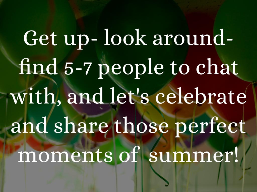 Get up- look around- find 5-7 people to chat with, and let's celebrate and share those perfect moments of summer!
