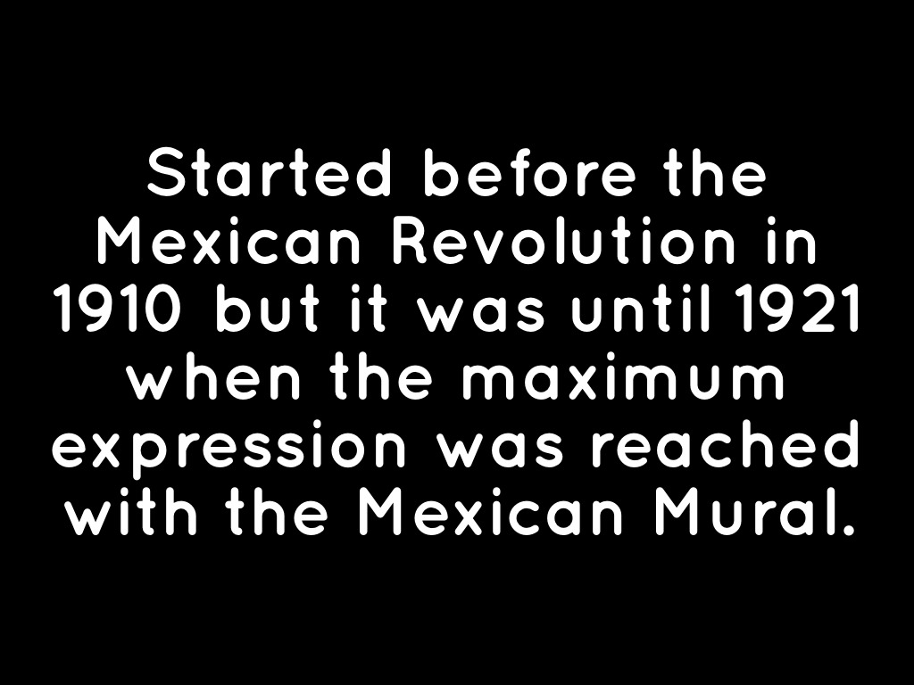 Started before the Mexican Revolution in 1910 but it was until 1921 when the maximum expression was reached with the Mexican Mural.