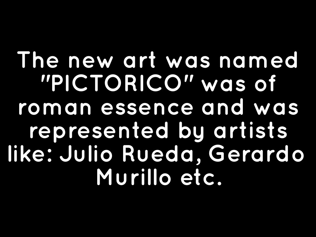 The new art was named "PICTORICO" was of roman essence and was represented by artists like: Julio Rueda, Gerardo Murillo etc.