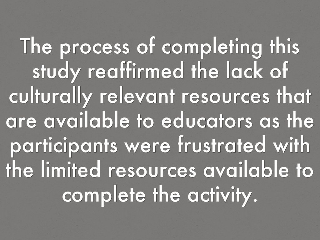 The process of completing this study reaffirmed the lack of culturally relevant resources that are available to educators as the participants were frustrated with the limited resources available to complete the activity.