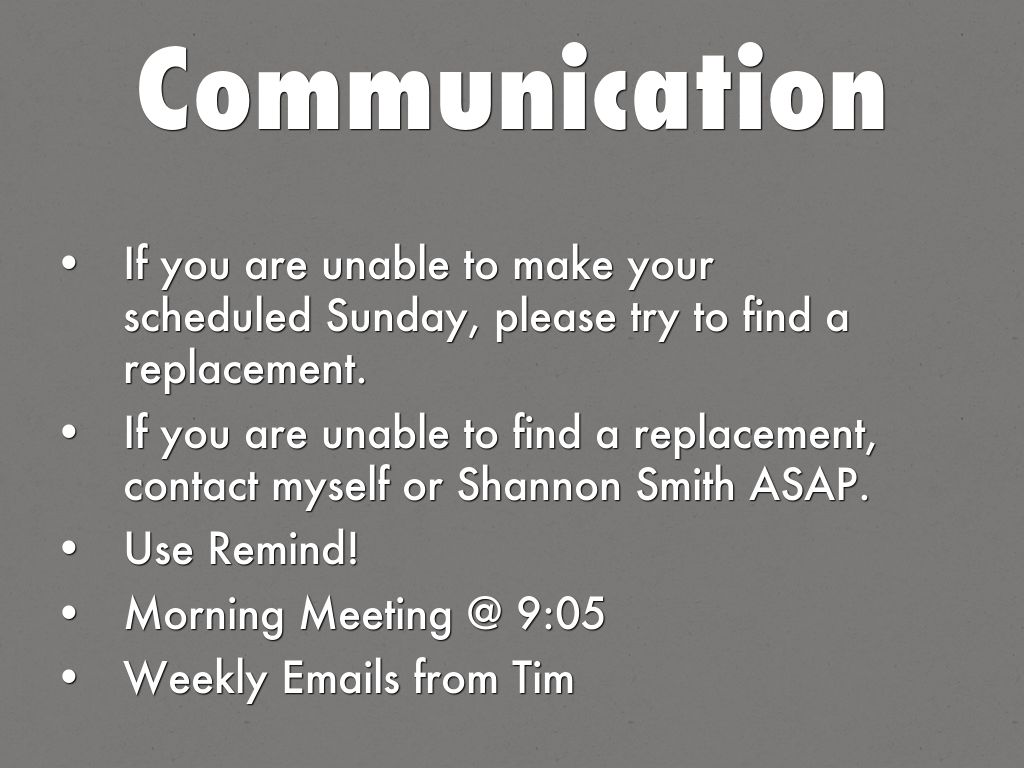 • If you are unable to make your scheduled Sunday, please try to find a replacement.