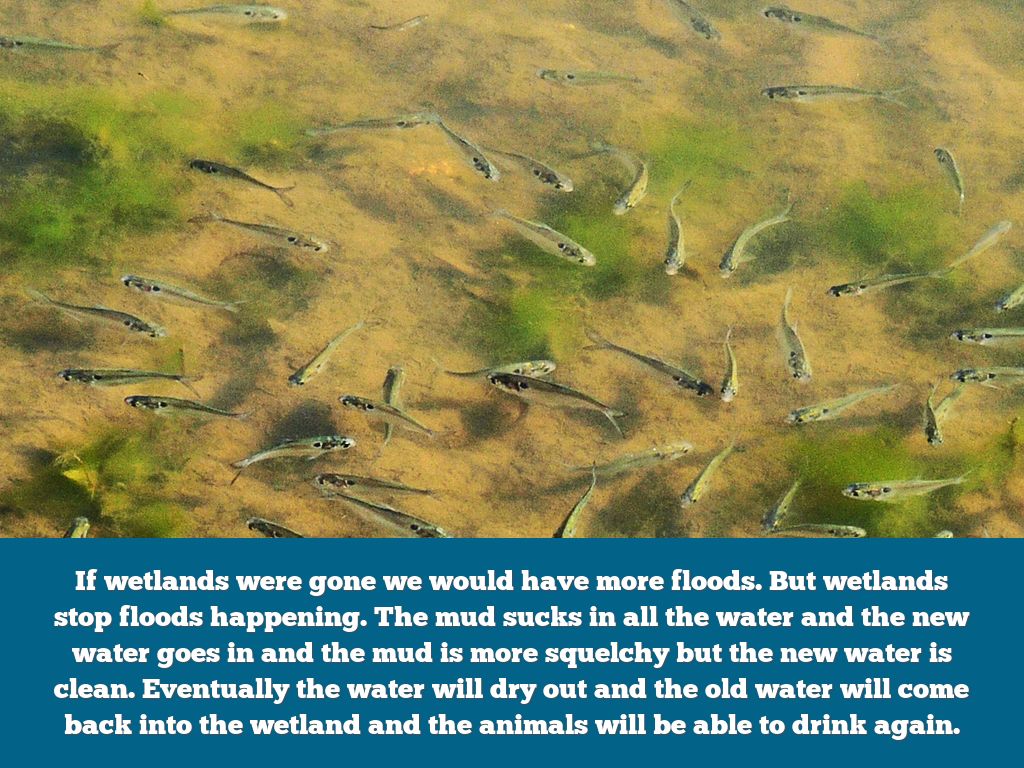If wetlands were gone we would have more floods. But wetlands stop floods happening. The mud sucks in all the water and the new water goes in and the mud is more squelchy but the new water is clean. Eventually the water will dry out and the old water will come back into the wetland and the animals will be able to drink again.