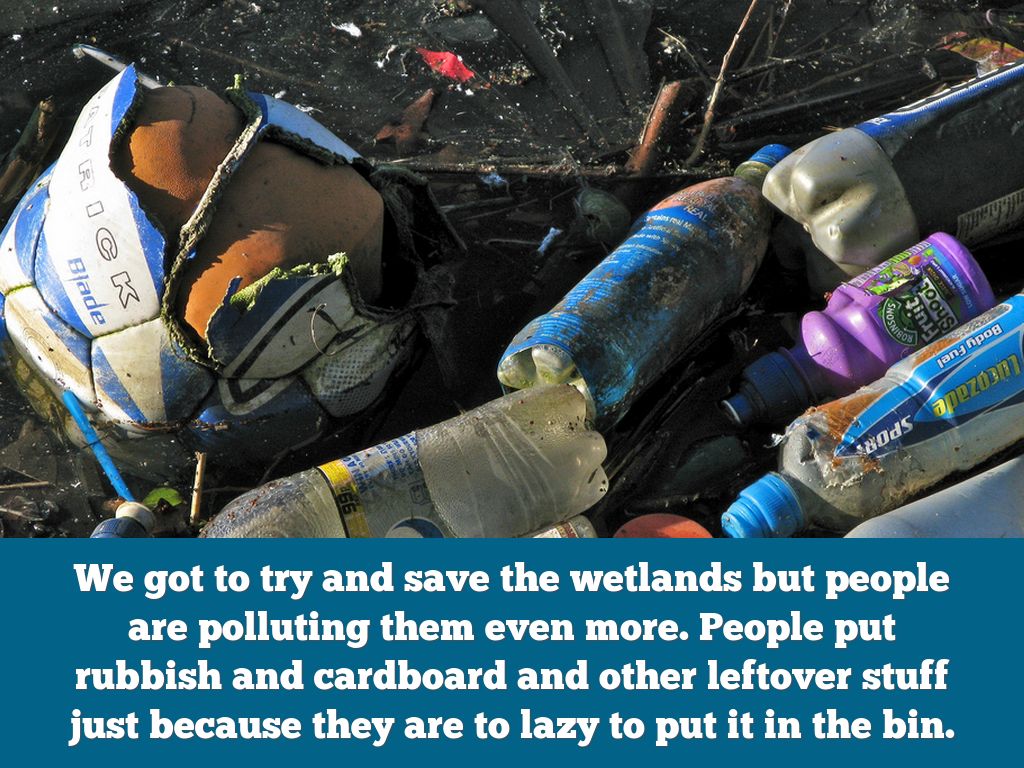 We got to try and save the wetlands but people are polluting them even more. People put rubbish and cardboard and other leftover stuff just because they are to lazy to put it in the bin.