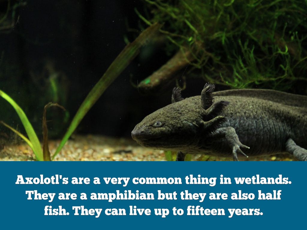 Axolotl's are a very common thing in wetlands. They are a amphibian but they are also half fish. They can live up to fifteen years.