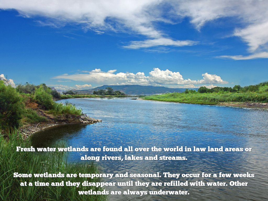 Fresh water wetlands are found all over the world in law land areas or along rivers, lakes and streams.