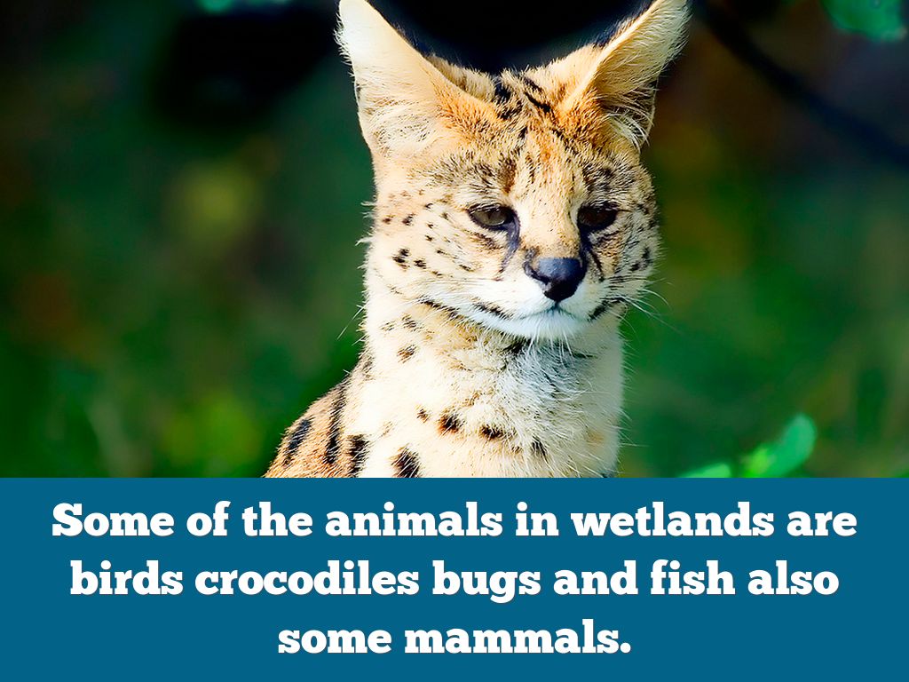 Some of the animals in wetlands are birds crocodiles bugs and fish also some mammals.