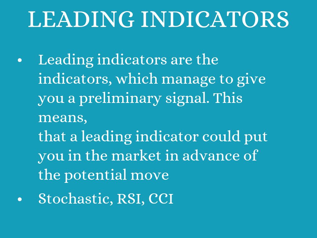 - Leading indicators are the indicators, which manage to give you a preliminary signal. This means,
