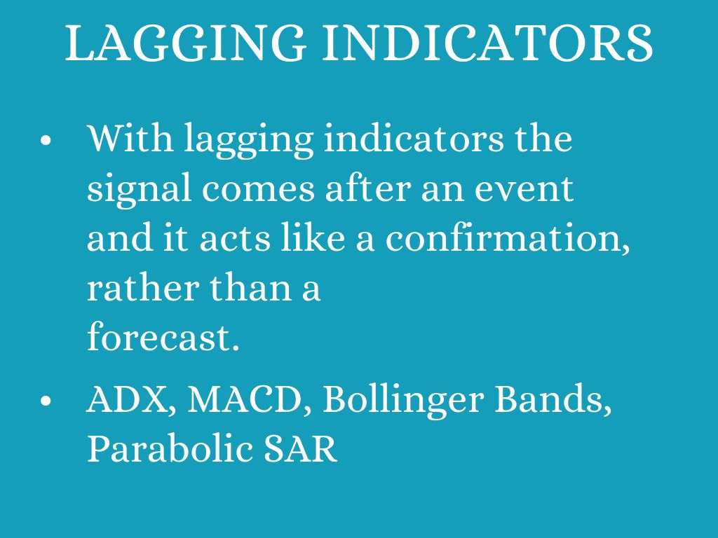 - With lagging indicators the signal comes after an event and it acts like a confirmation, rather than a