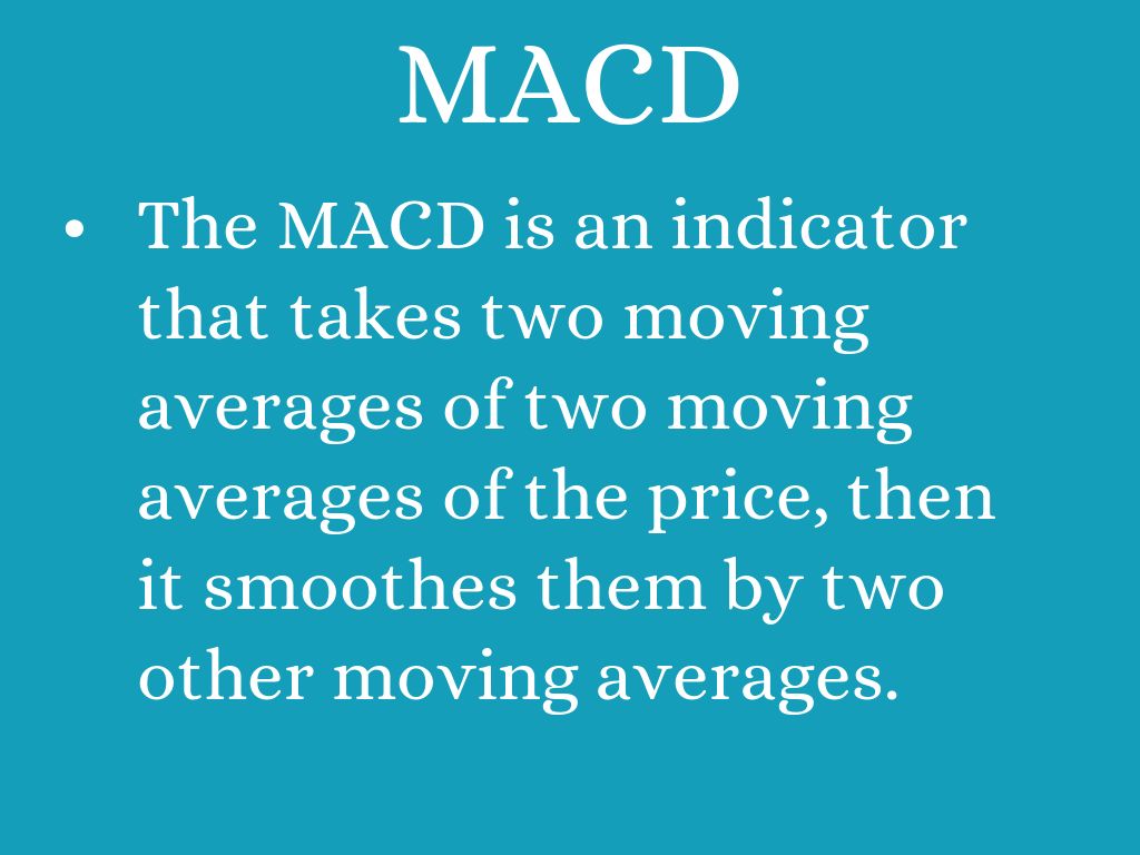 - The MACD is an indicator that takes two moving averages of two moving averages of the price, then