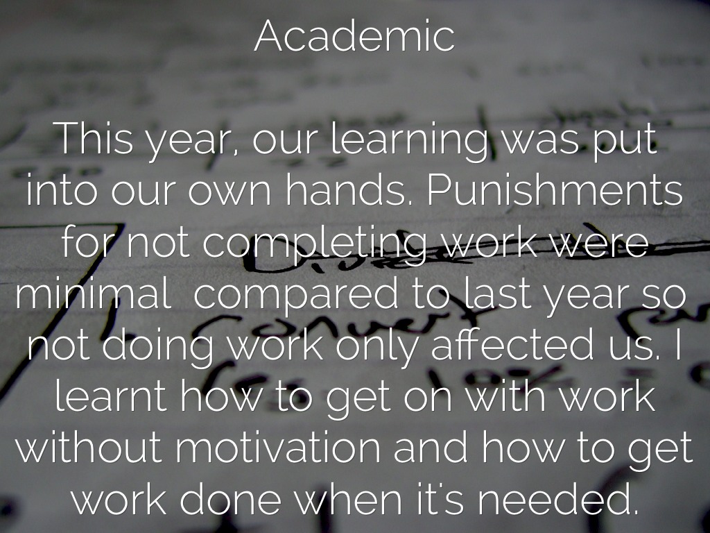 This year, our learning was put into our own hands. Punishments for not completing work were minimal compared to last year so not doing work only affected us. I learnt how to get on with work without motivation and how to get work done when it's needed.