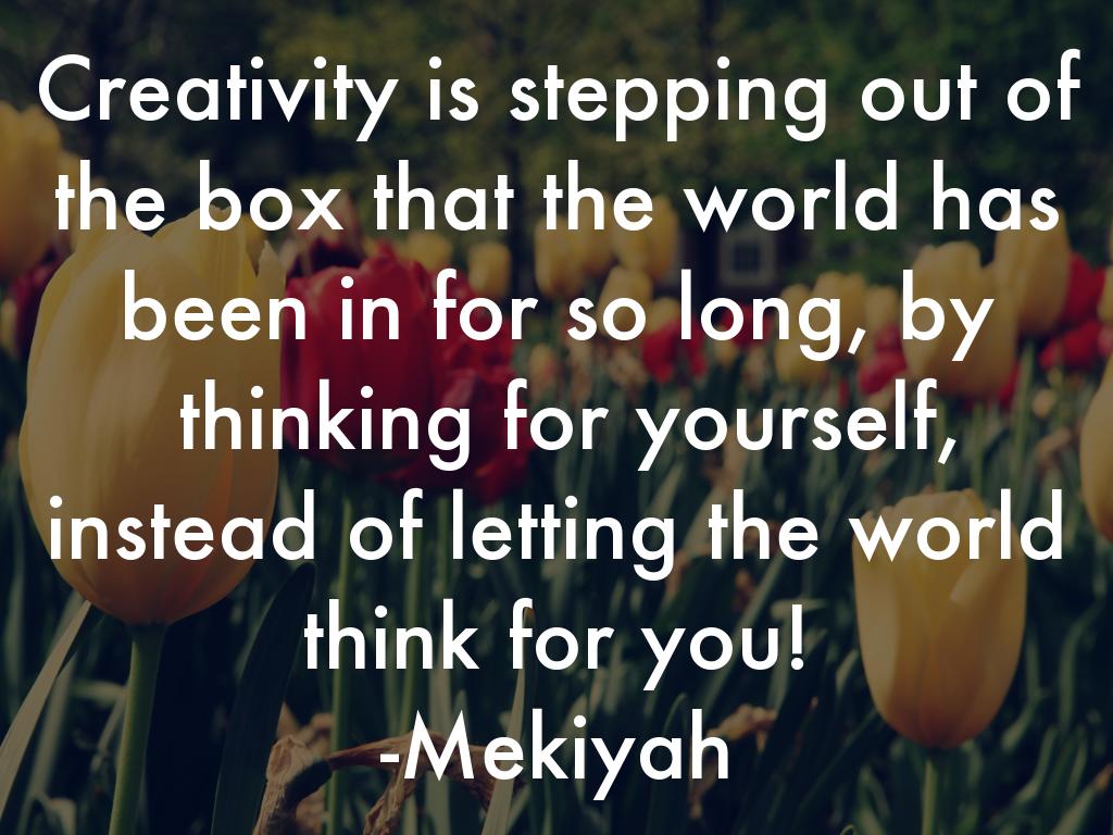 Creativity is stepping out of the box that the world has been in for so long, by thinking for yourself, instead of letting the world think for you!