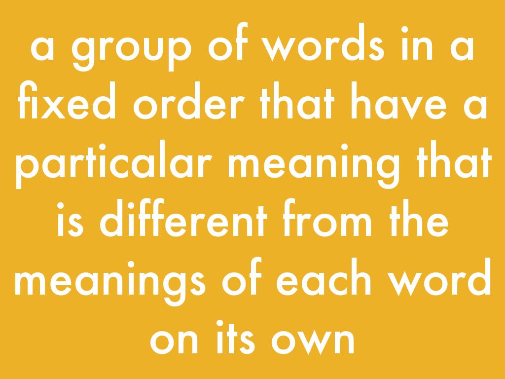a group of words in a fixed order that have a particalar meaning that is different from the meanings of each word on its own