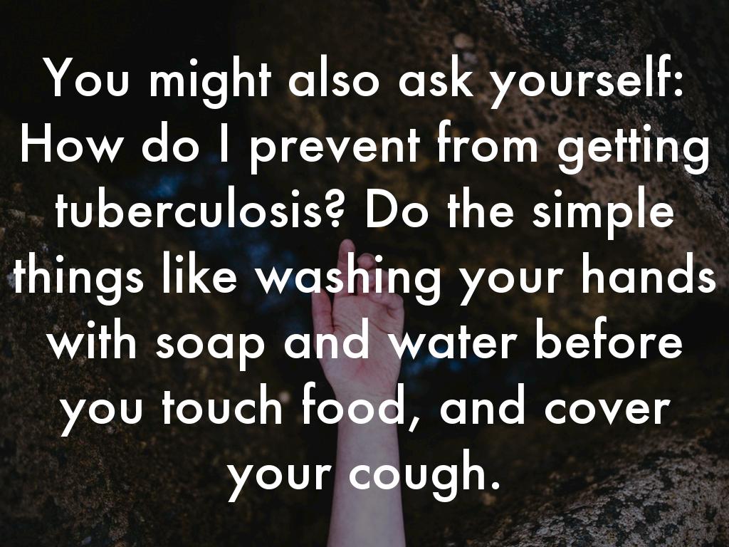 You might also ask yourself: How do I prevent from getting tuberculosis? Do the simple things like washing your hands with soap and water before you touch food, and cover your cough.
