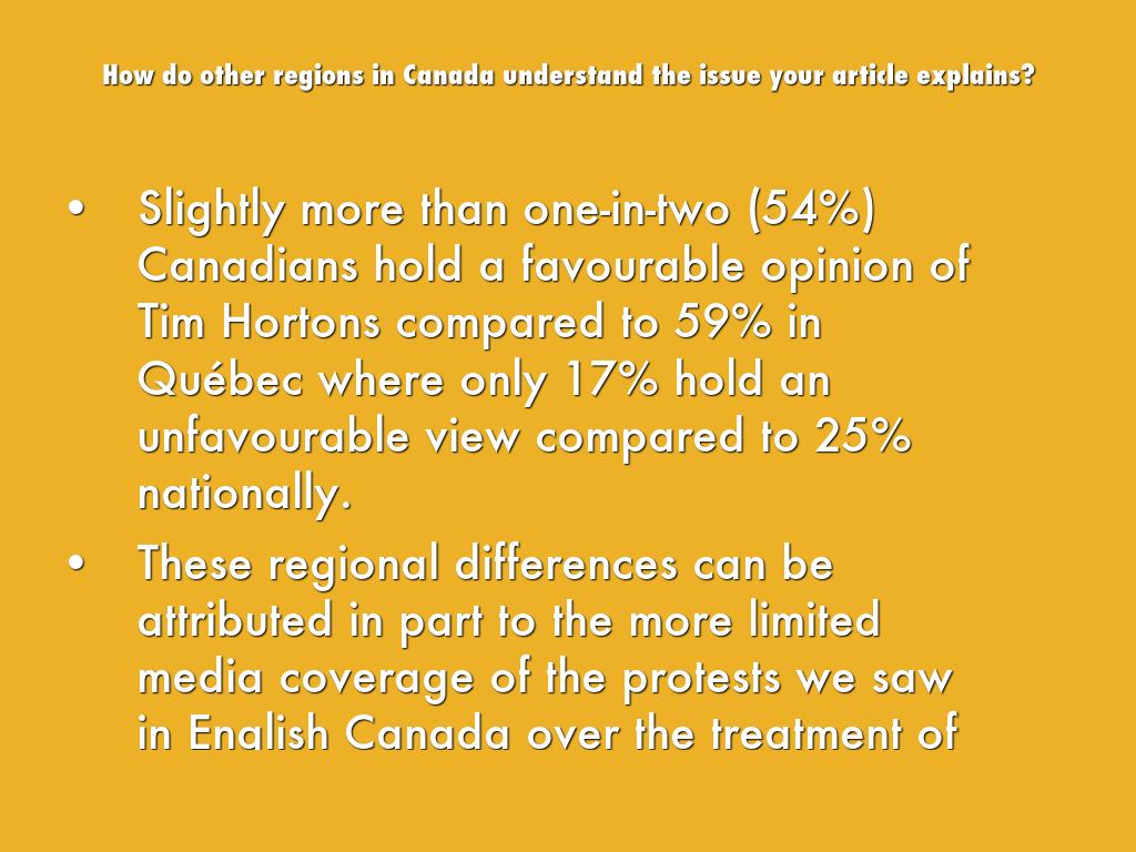 These regional differences can be attributed in part to the more limited media coverage of the protests we saw in English Canada over the treatment of workers after the minium wage was increased in Ontario and the very public dispute with franchisees. It could well be that it's only a matter of time before Quebeckers join the rest of Canada in believing that Tim Hortons is not the same as it was. But there are lessons to be learned from this regional difference. Lessons that could help RBI devise strategies to insulate the Tim Hortons brand in Québec.