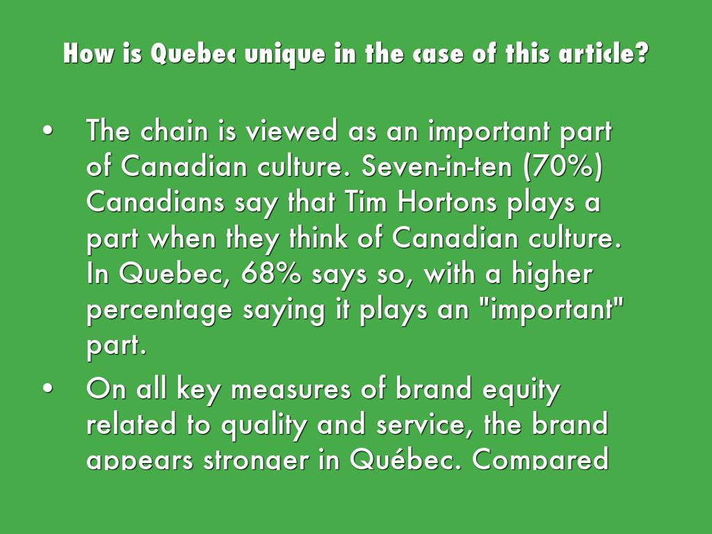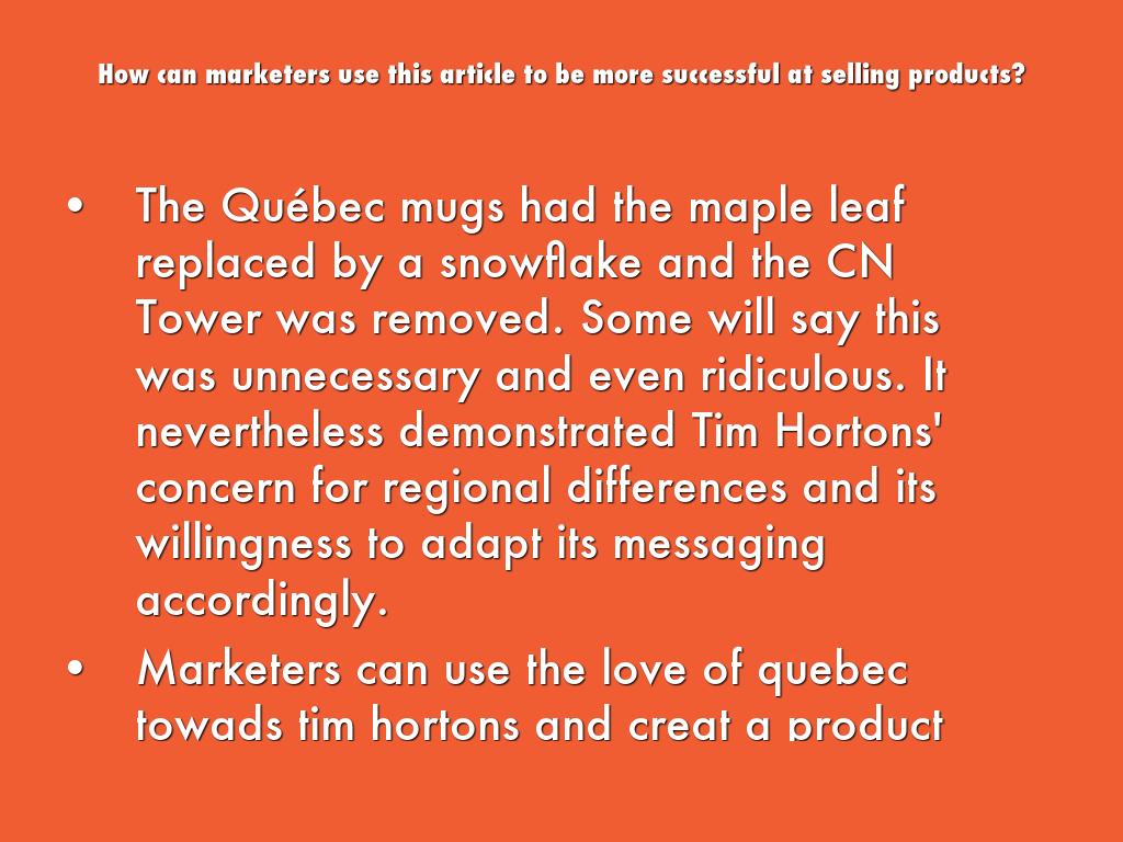Marketers can use the love of quebec towads tim hortons and creat a product representing the province and tim hortoans and take advantage of that.