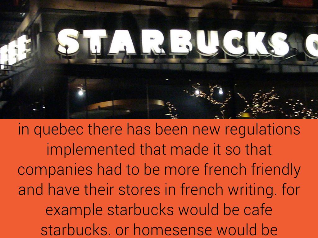 in quebec there has been new regulations implemented that made it so that companies had to be more french friendly and have their stores in french writing. for example starbucks would be cafe starbucks. or homesense would be branded with the maison tag which means home in french.
