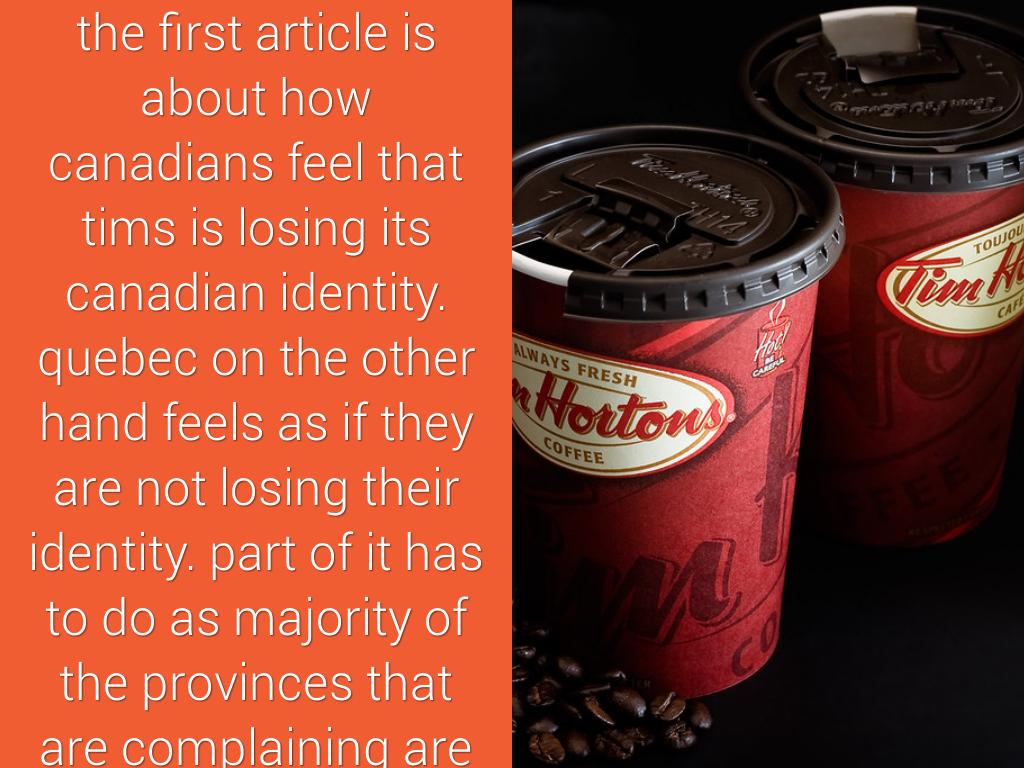the first article is about how canadians feel that tims is losing its canadian identity. quebec on the other hand feels as if they are not losing their identity. part of it has to do as majority of the provinces that are complaining are english speaking provinces and tims from the begining has made steps to ensure that tims feels different and unique for quebec people.