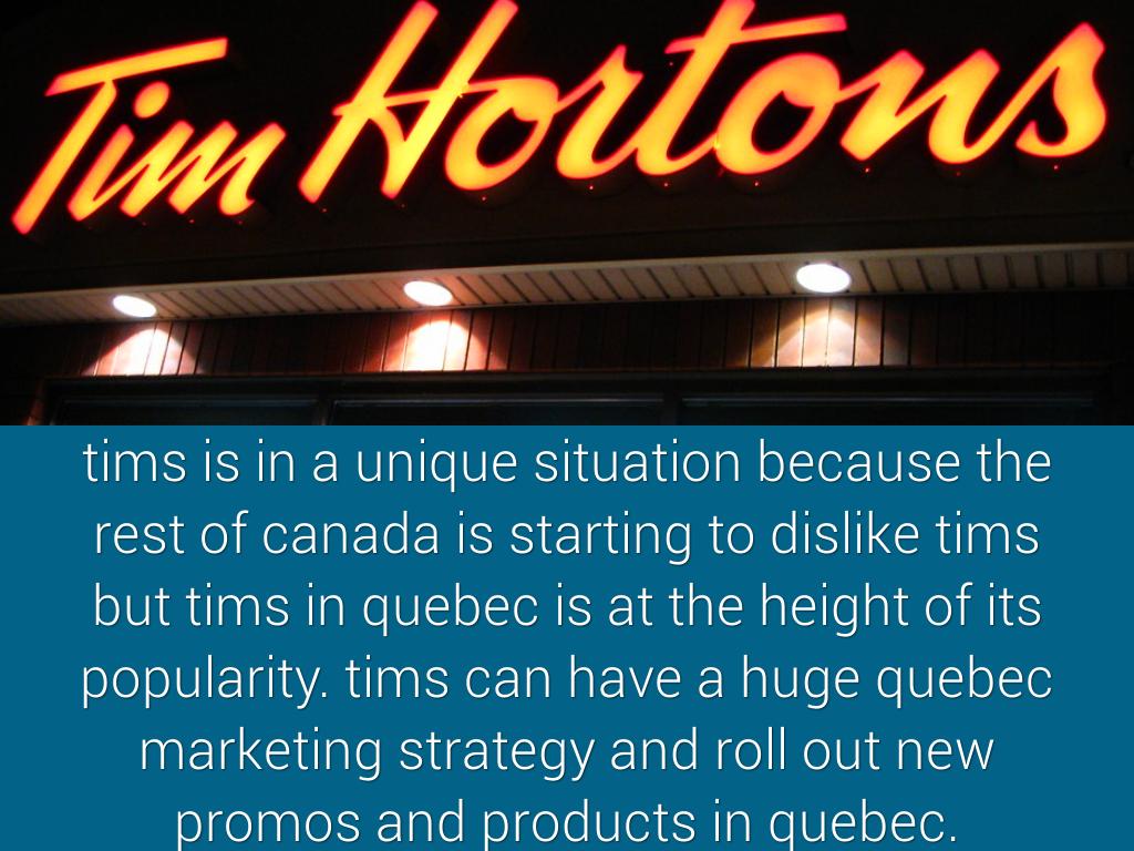 tims is in a unique situation because the rest of canada is starting to dislike tims but tims in quebec is at the height of its popularity. tims can have a huge quebec marketing strategy and roll out new promos and products in quebec.