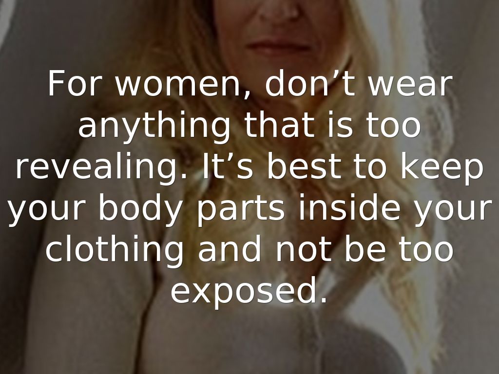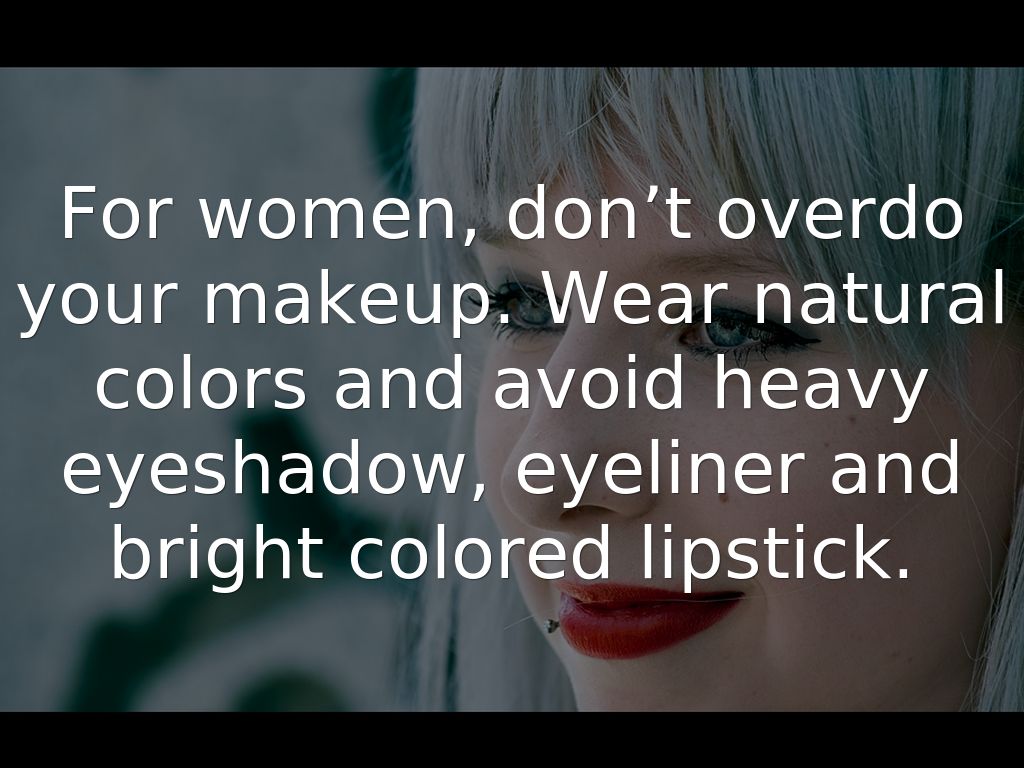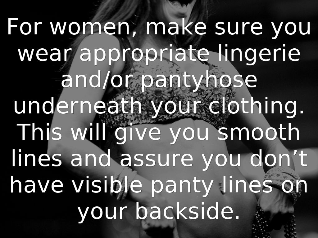For women, make sure you wear appropriate lingerie and/or pantyhose underneath your clothing. This will give you smooth lines and assure you don’t have visible panty lines on your backside.