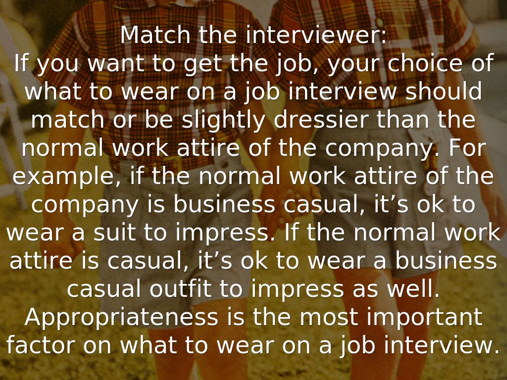 Match the interviewer: If you want to get the job, your choice of what to wear on a job interview should match or be slightly dressier than the normal work attire of the company. For example, if the normal work attire of the company is business casual, it’s ok to wear a suit to impress. If the normal work attire is casual, it’s ok to wear a business casual outfit to impress as well. Appropriateness is the most important factor on what to wear on a job interview.