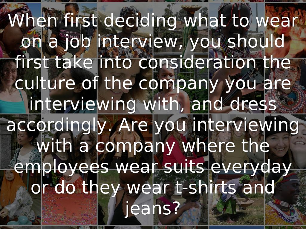 When first deciding what to wear on a job interview, you should first take into consideration the culture of the company you are interviewing with, and dress accordingly. Are you interviewing with a company where the employees wear suits everyday or do they wear t-shirts and jeans?