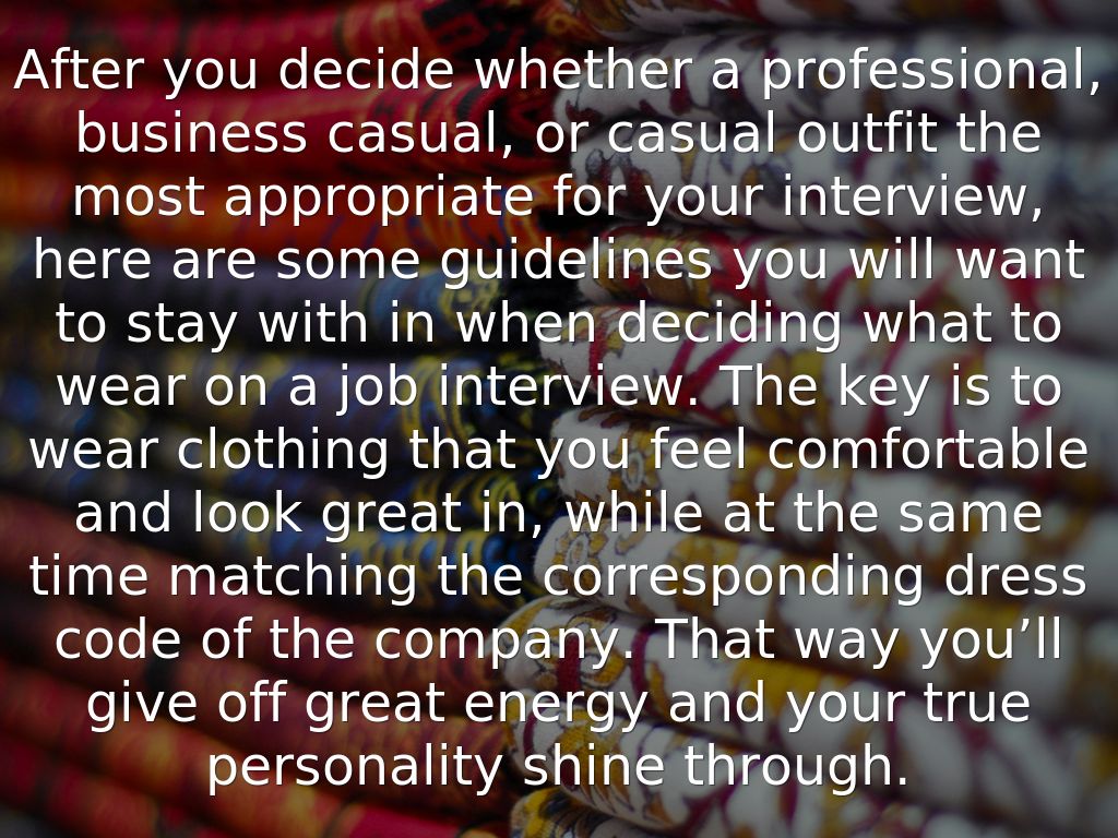 After you decide whether a professional, business casual, or casual outfit the most appropriate for your interview, here are some guidelines you will want to stay with in when deciding what to wear on a job interview. The key is to wear clothing that you feel comfortable and look great in, while at the same time matching the corresponding dress code of the company. That way you’ll give off great energy and your true personality shine through.